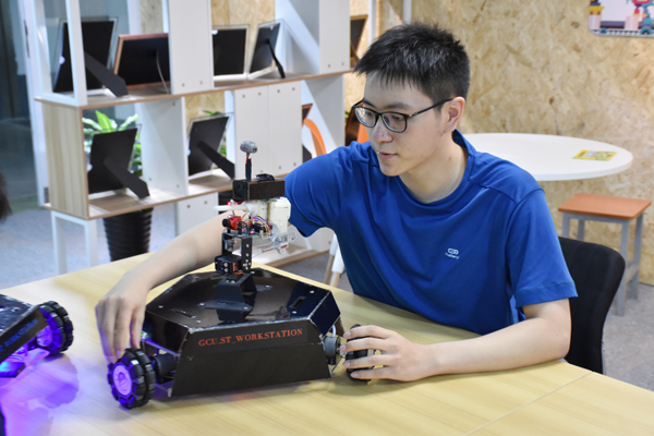 “这个机器人是基于图像追踪算法,他能对物品进行长时间的追踪,而且他不会出现跟丢之后找不回的情况。我们还加入了三轴全向轮、ps2手柄等器械,把这个普通的遥控车变成一个人工智能的游戏机器人”。曾经那颗小小的种子,在陆兆基的灌溉和照耀下生根发芽,逐渐成长。