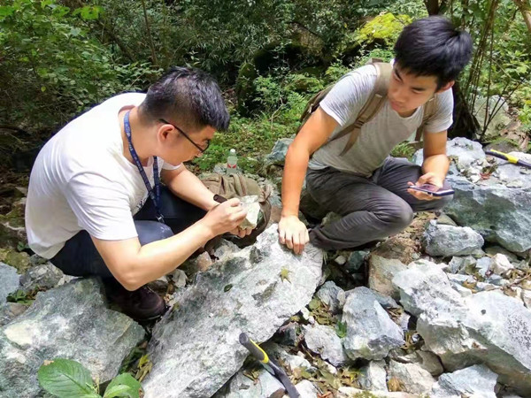 岳素伟老师(左一)在野外采样中(珠宝学院 岳素伟 供)