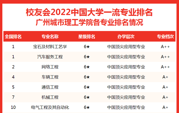 本网讯(记者 邹春梅)3月30日,艾瑞深校友会网最新发布2022校友会中国大学一流专业排名、2022中国大学各专业类一流专业排名,在包括公办、民办两类院校的全国所有应用型本科高校中,广州城市理工学院汽车服务工程、宝石及材料工艺学2个专业全国排名第一,10个专业获得2022中国六星级应用型专业,挺进中国顶尖应用型专业行列。