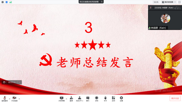 最后,林叙群作活动总结讲话,他希望全体学生党员和入党积极分子,要认真贯彻落实《关于推动党史学习教育常态化长效化的意见》,充分发挥先锋模范作用,带头学习,带头践行,带头宣讲,以“清澈的爱,只为中国”深情告白伟大祖国和伟大时代,以“请党放心,强国有我”的誓词展现为国、为人民拼搏奋斗的青春誓言,努力做一名中国特色社会主义发展道路的坚定捍卫者,做一名社会主义核心价值观的积极践行者,做一名实现中华民族伟大复兴的筑梦者,努力成长为有理想、有信念、有能力、有本领、有责任、有担当的时代新人,以优异成绩迎接党的二十大胜利召开。
