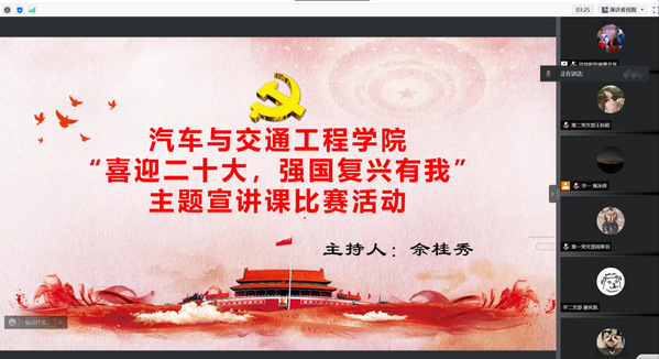 本网讯(记者 李良缘)为深入学习贯彻党的十九届六中全会精神,充分营造良好氛围,迎接党的二十大胜利召开,引导青年学子深刻领会新时代党和国家事业取得的历史性成就、发生的历史性变革,5月21日晚,汽车与交通工程学院党总支在腾讯会议开展了以“喜迎二十大,强国复兴有我”为主题的宣传课比赛活动。学院书记林叙群、党总支相关负责人、全体辅导员以及全体学生(预备)党员和入党积极分子参加。