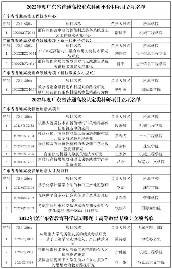 本网讯(记者 冯田丽)9月13日,我校收到《广东省教育厅关于公布2022年度普通高校重点科研平台和项目立项名单的通知》(粤教科函〔2022〕4号)、《广东省教育厅关于公布2022年度普通高校认定类科研项目立项名单的通知》(粤教科函〔2022〕5号)《广东省教育科学规划领导小组办公室关于公布2022年度教育科学规划课题(高等教育专项)立项名单的通知》,经学科与科技处组织动员、学校推荐、省教育厅组织专家评审、认定,我校分别获批立项“广东省普通高校工程技术中心”1项,“广东省普通高校重点领域专项”3项(新一代电子信息技术2项,科技服务乡村振兴1项),广东省教育科学规划课题(高等教育专项)3项,“广东省普通高校特色创新类项目”5项,“广东省普通高校青年创新人才类项目”3项。