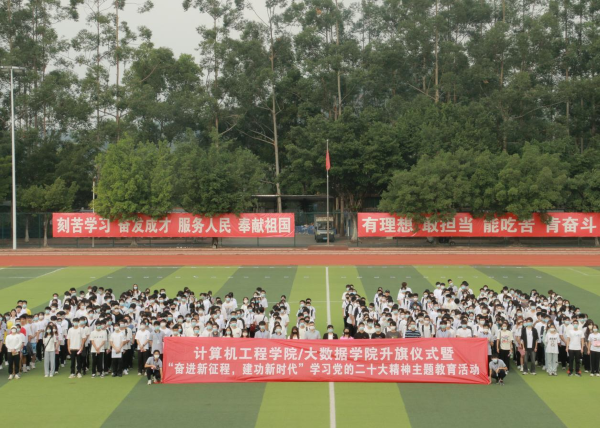 本网讯 (记者 樊一眉 余钰樱)11月14日早上,计算机工程学院/大数据学院在田径场举行升旗仪式,组织开展“奋进新征程,建功新时代”学习党的二十大精神主题教育活动。学院书记罗军,学院学工办负责人,全体辅导员以及各年级学生代表参加活动。