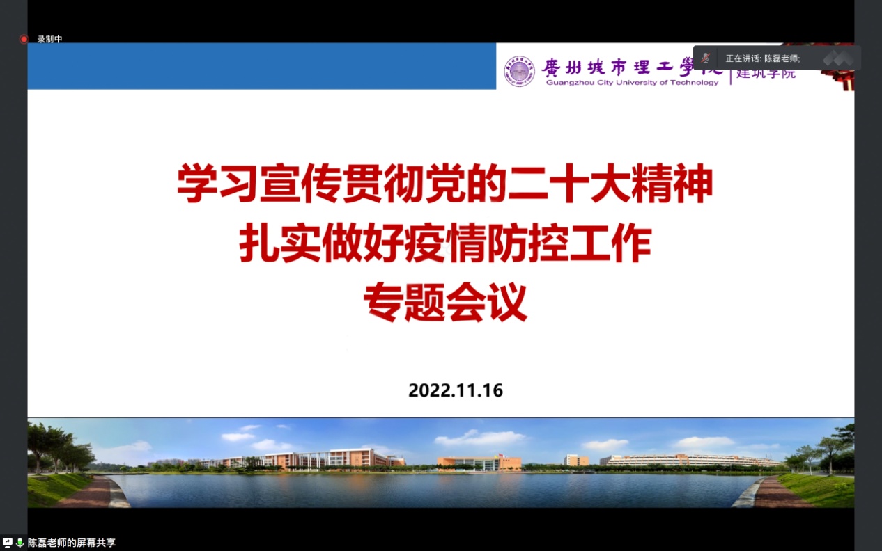 本网讯(记者 伍颖怡)为全面学习宣传贯彻党的二十大精神,加强教职工的政治理论学习,建筑学院于11月16日下午通过线上会议的形式召开学习贯彻党的二十大精神,扎实做好疫情防控工作专题会议。学院院长陆琦、书记陈磊以及全体教职工参加会议。