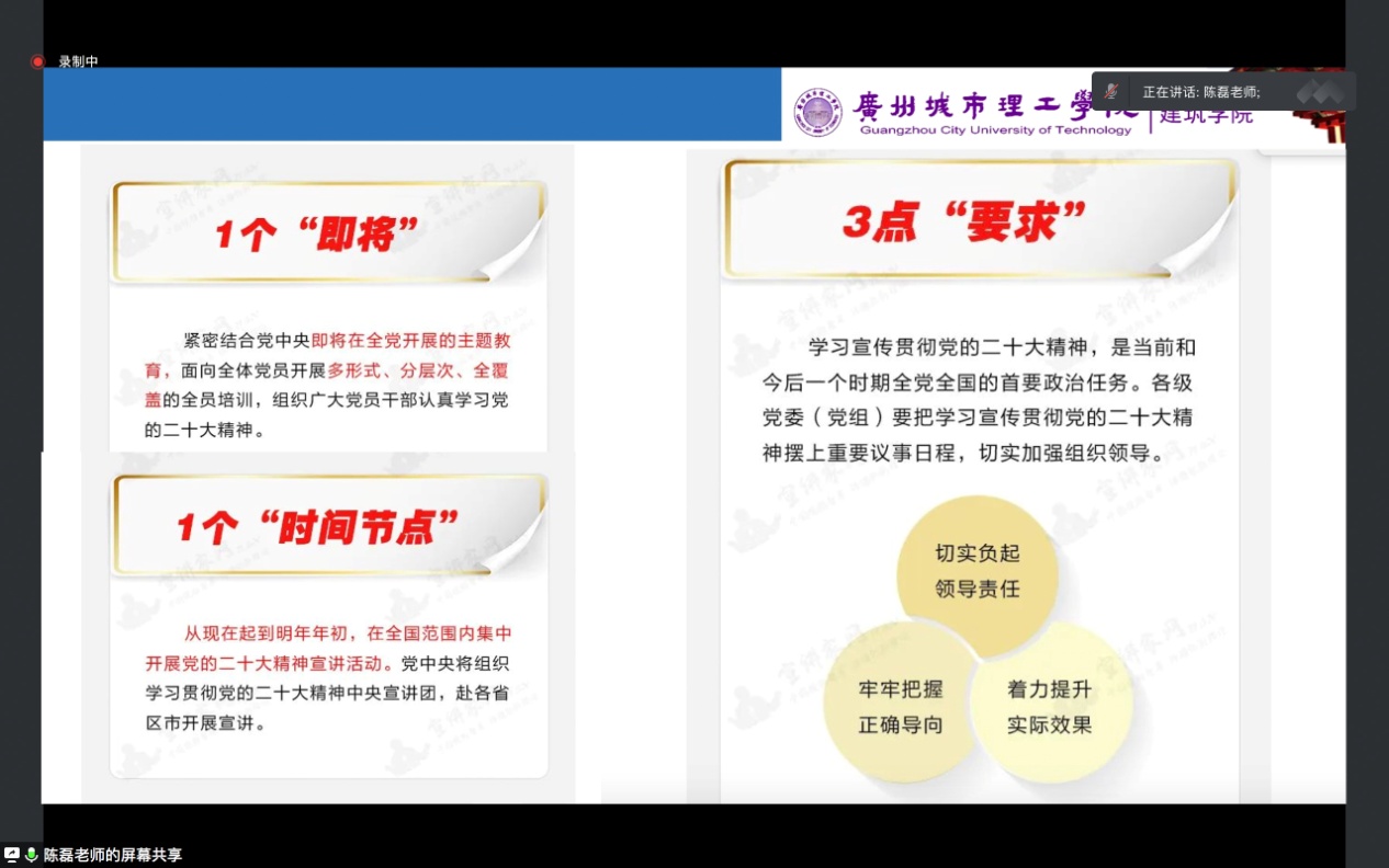 随后,陈磊传达了学校党委关于党的二十大精神宣讲行动方案,并对学院宣讲行动做了部署,鼓励全体教师掀起学习宣传贯彻热潮,党员同志要自觉主动学习党的二十大精神,积极参与“学习强国app”广东学习平台主办的“奋进新征程 共创强国业”学习党的二十大精神理论知识竞赛活动。