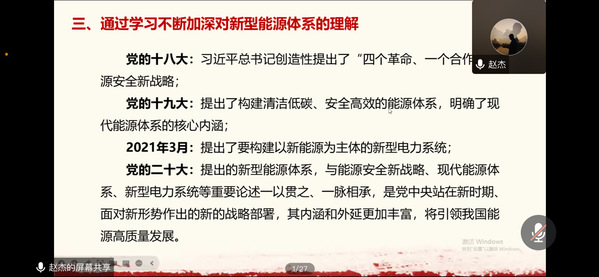 赵杰首先引入党的二十大报告提出的“深入推进能源革命,加强煤炭清洁高效利用,加大油气资源勘探开发和增储上产力度,加快规划建设新型能源体系,统筹水电开发和生态保护,积极安全有序发展核电,加强能源产供储销体系建设,确保能源安全”相关论述,指出“加快规划建设新型能源体系”是党的二十大报告对能源领域的新部署。“科学地规划建设新型能源体系,将很好地助力‘碳达峰’‘碳中和’。实现‘碳达峰’‘碳中和’,是一场广泛而深刻的经济社会系统性变革。”他带领大家回顾了党的十八大以来国家关于能源安全的相关战略部署,并结合自己亲身经历,希望同学们通过学习不断加深对新型能源体系的理解,规划建设新型能源体系要把握好的原则,科学规划建设新型能源体系,助力实现“碳达峰”“碳中和”。