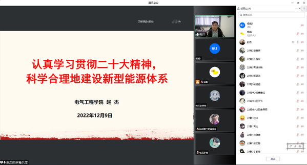 本网讯(记者 许晗星)为引导同学们深刻领会党的二十大精神的核心要义和丰富内涵,12月9日上午,电气工程学院院长赵杰通过腾讯会议以《认真学习贯彻二十大精神,科学合理地建设新型能源体系》为题,为学院2022级新生宣讲党的二十大精神。