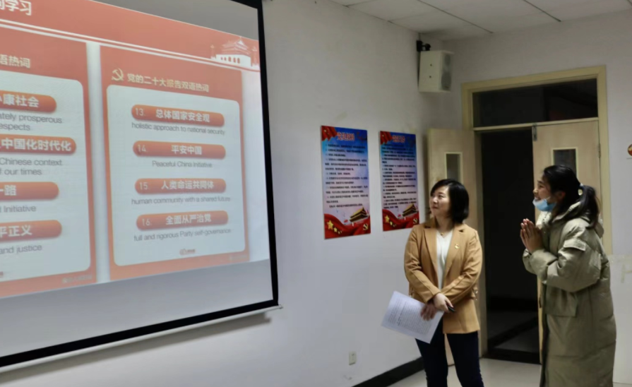 结合国际商学院的办学特色,她还设计了互动环节,现场与师生共学党的二十大报告的“双语热词”,大家跃跃一试,学习分享。最后,她围绕报告结语部分对青年的寄语,结合学院学生的成长与成绩,从青年与时代、青年的重要地位、青年思想引领、青年工作方法等角度,勉励大家做“新时代好青年”,胸怀理想信念、扛起责任担当、奋斗增强本领。