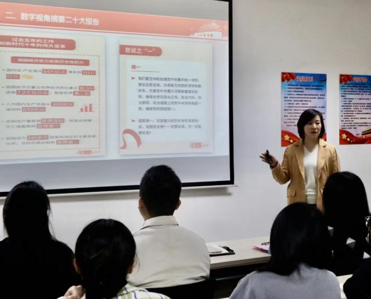 刘佳从党的二十大报告开篇导语的“重大意义”和“大会主题”切入,带领大家学习该部分原文,并着重从时代背景、理论成果、旗帜方向、奋斗目标等角度进行分析,帮助大家更好的理解大会的意义和主题。随后,她围绕报告全文,用“速览”+“数读”的形式向大家介绍报告的框架结构和各个板块的内容,并结合史料重点对“两个一百年”奋斗目标、“两步走战略”“三件大事”“三个务必”“三个战略””五个必由之路”“中国式现代化的五大特色九个本质要求”等内容进行了讲解。