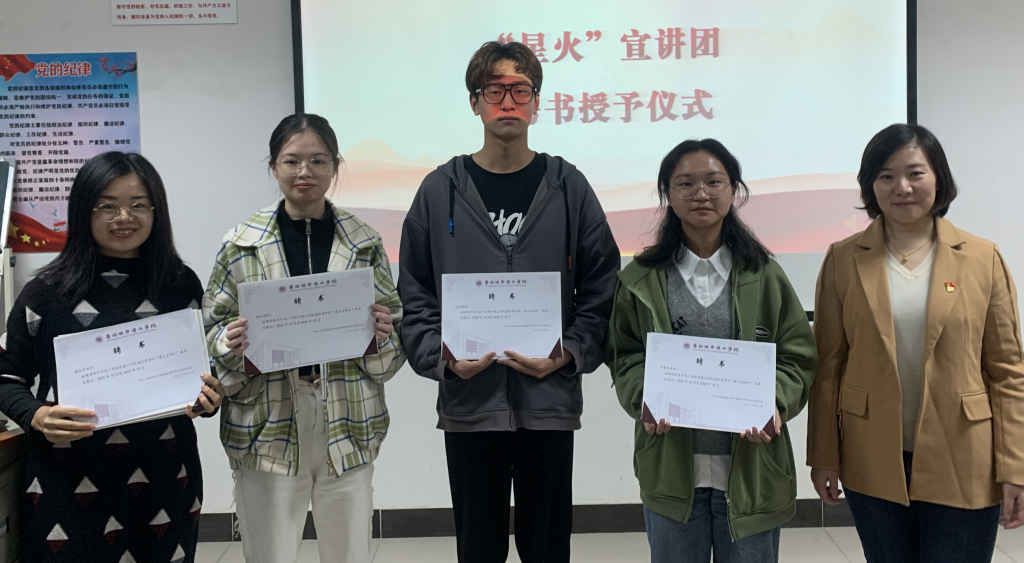 宣讲后,现场举行了学生“星火宣讲队”启动仪式。党总支副书记胡靖姗代表学院党总支宣读了《决定》,为扎实推进党的二十大精神进校园、进学院、进师生,传递国情社情民情,学院成立了学生“星火宣讲队”,选拔了一批政治立场坚定、理论素养较高、综合能力较强、能承担“双语宣讲”的学生,成为“星火宣讲队”首批成员(共11人)。刘佳为现场的队员代表发颁发聘书,对宣讲队“是什么、干什么、怎么干”谈了想法并提出了要求,鼓励大家边学习边实践,边输入边输出,提升自己,带动他人。