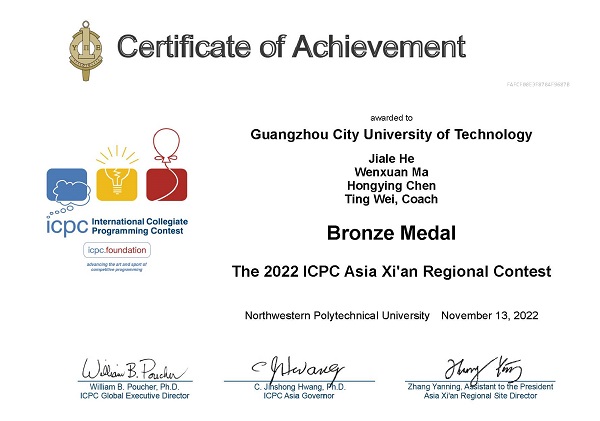 本网讯(记者 韦婷)2月1日,我校收到ICPC国际大学生程序设计竞赛亚洲区域赛(西安站)组委会寄来的铜奖证书。此奖项是在指导老师韦婷带领下,计算机工程学院陈宏营、何镓乐和马文轩三位同学组队参赛,经过与全国知名高校代表队激烈角逐而斩获。我校首次在此项赛事中获奖,实现高规格国际性赛事的历史突破,成为广东省民办高校中唯一获奖学校。