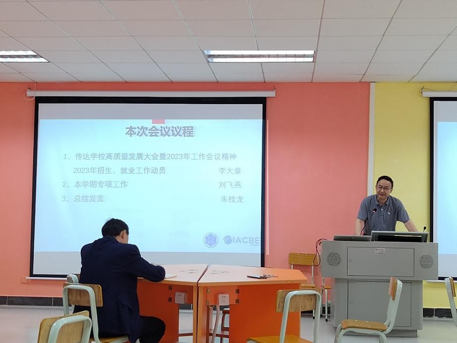 会议伊始,刘飞燕对2位新任学院领导作了简要介绍。会上,李大章传达了学校推进高质量发展大会暨2023年工作会议精神,集中学习吴波校长工作报告和杜小明书记讲话内容,强调全院教工要深入学习宣传贯彻党的二十大精神,聚焦学校高质量发展的着力点及工作任务,坚定担当责任,抓好贯彻落实。结合新学期学院工作内容,李大章就学院2023年招生就业工作进行动员,他指出招生就业工作对学院的发展至关重要,要统一认识,明确任务,落实责任,提前组织好、谋划好招生就业工作,要在去年工作的基础上更上一个台阶,以高质量招生就业工作为学校发展做出贡献。