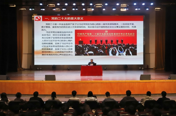 “党的二十大具有重大的现实意义和深远的历史意义。”杜小明书记从“大会召开的时间节点和时代背景非常重要而特殊”“党的二十大充分彰显了‘两个确立’的决定性意义”“党的二十大取得了一系列具有长期指导意义的重大理论和实践创新成果”“党的二十大科学回答了‘以党的自我革命引领社会革命’这一重大历史命题”为同学们讲述了党的二十大的重大意义,要求同学们读原文、悟思想。
