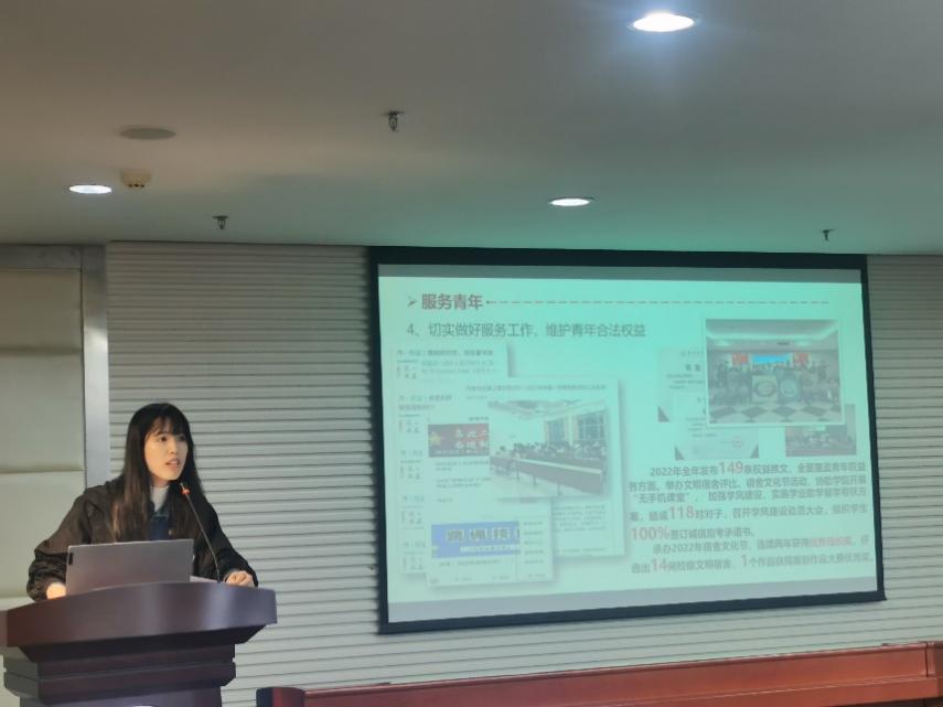 会上,各学院团委书记(副书记)结合本学院工作实际,围绕学院团委2022年度在引领力、组织力、服务力和围绕中心服务大局等方面工作的主要做法成效、存在的问题和2023年度工作计划进行述职。汽车与交通工程学院团委副书记邱冰妍在学院党政联席会、学工例会上进行工作汇报,落实“重大事项专题研究、常规工作定期汇报”的请示报告制度;电子信息工程学院/通信工程学院团委副书记邓哲妍探索党团共育青年创新路径,将“青马工程”和党课培训相结合,建立优秀学员推优入党机制;计算机工程学院/大数据学院团委书记樊一眉探索思想引领工作创新方式方法,学院“青年大学习”工作连续十期排名全校第一;经济学院团委副书记李琴老师汇报了学院“今朝诵万卷 来日展芳华”读书系列活动的开展情况,通过开展时光书屋、清晨自修室、主题班会分享读等活动,营造院内良好读书氛围;外国语学院团委副书记徐建兴邀请学院党总支书记参加学生会及团委干部培训会,在思想政治素质、业务素质和服务意识等方面为学生干部开展培训。