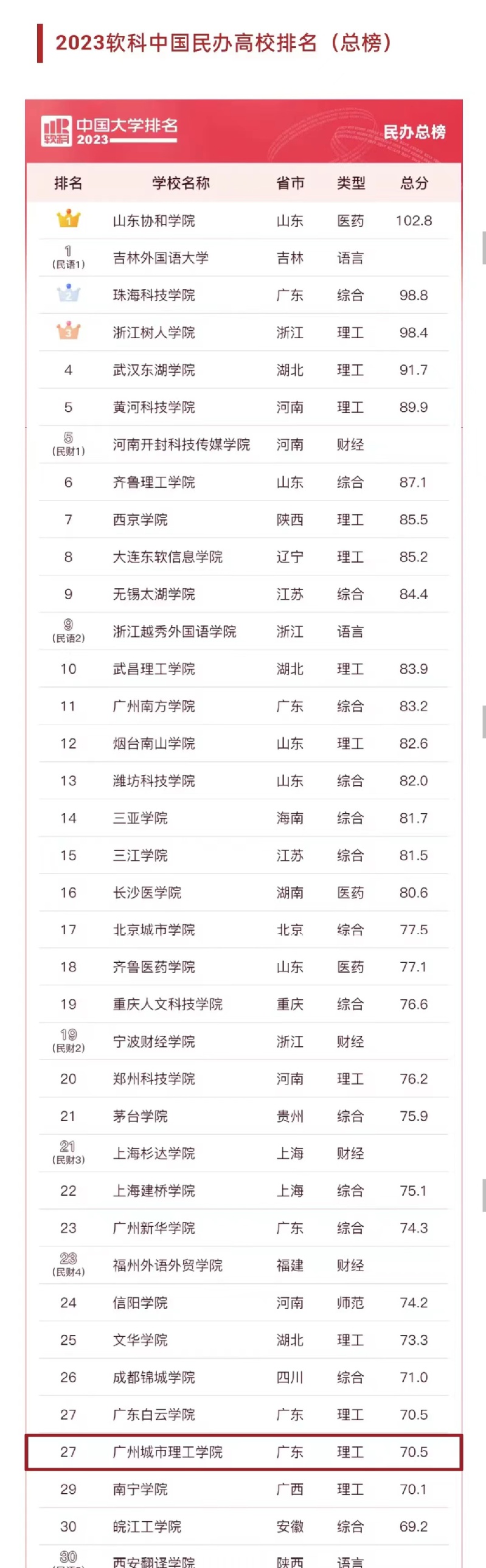 本网讯(记者 邹春梅)3月30日, 高等教育专业评价机构软科正式发布 “2023 软科中国大学排名”,广州城市理工学院位列广 东民办高校 ( 理工类 ) 首位,全国民办高校 (理工类) 第 10 位。