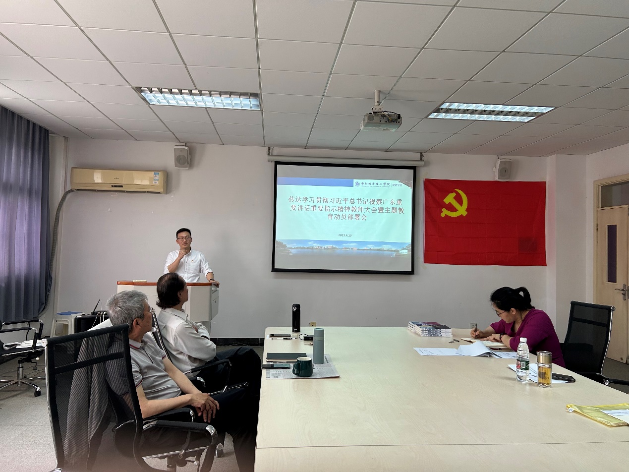 本网讯(记者 陈磊)4月19日,建筑学院在A10-207召开传达学习贯彻习近平总书记视察广东重要讲话重要指示精神教师大会暨主题教育动员部署会,落实省委教育工委和学校党委的部署要求,对全院学习宣传贯彻工作和开展主题教育进行全面动员部署。学院书记陈磊、院长陆琦,学院党政领导班子及全体教师参加会议。