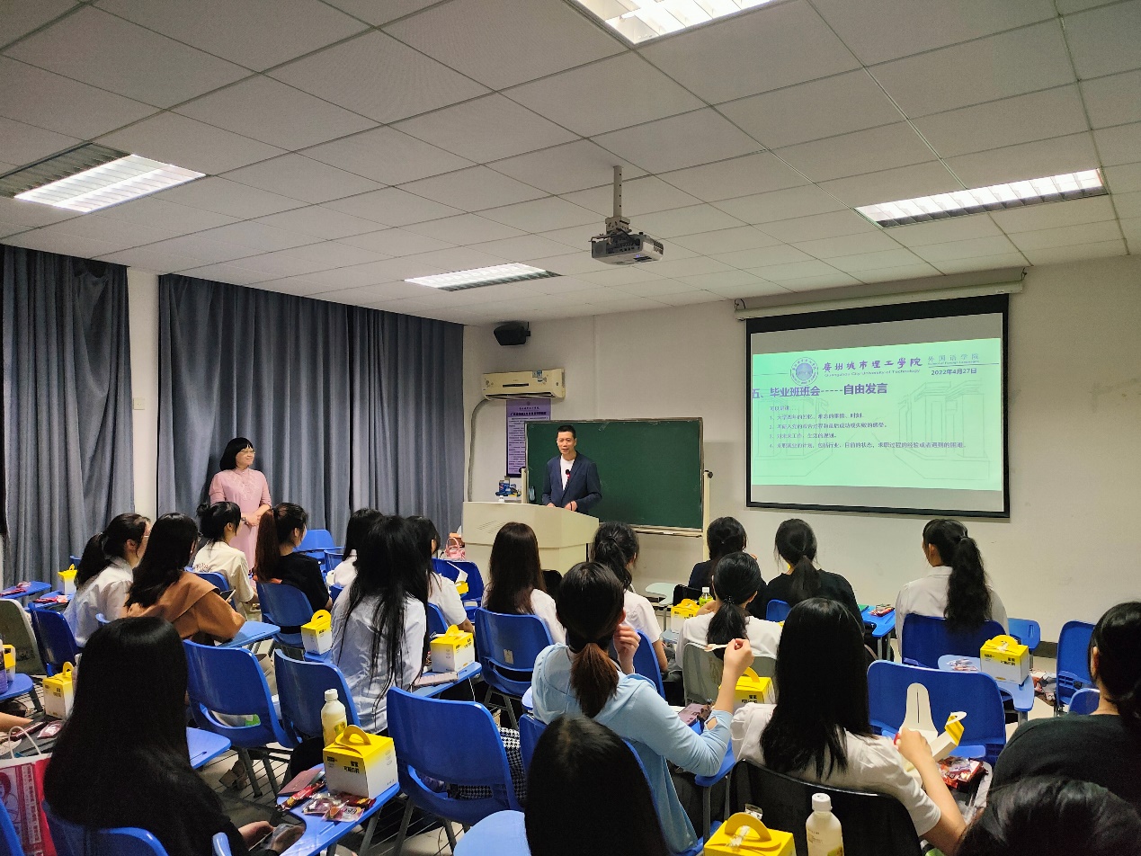 本网讯(记者 陈香梅 蔡晓坤)为抢抓学生毕业答辩返校这一关键时期,提高学生就业意识,推动学生就业、创业工作,4月27日晚,外国语学院为2023届18个毕业班685名毕业生筹办了一场以“前程似锦,不负韶华,万里可期”为主题的毕业班会,班会由各班班主任主持,外国语学院院长向前进、党总支书记张四友、副院长乔世燕分别参加班会并进行就业动员。