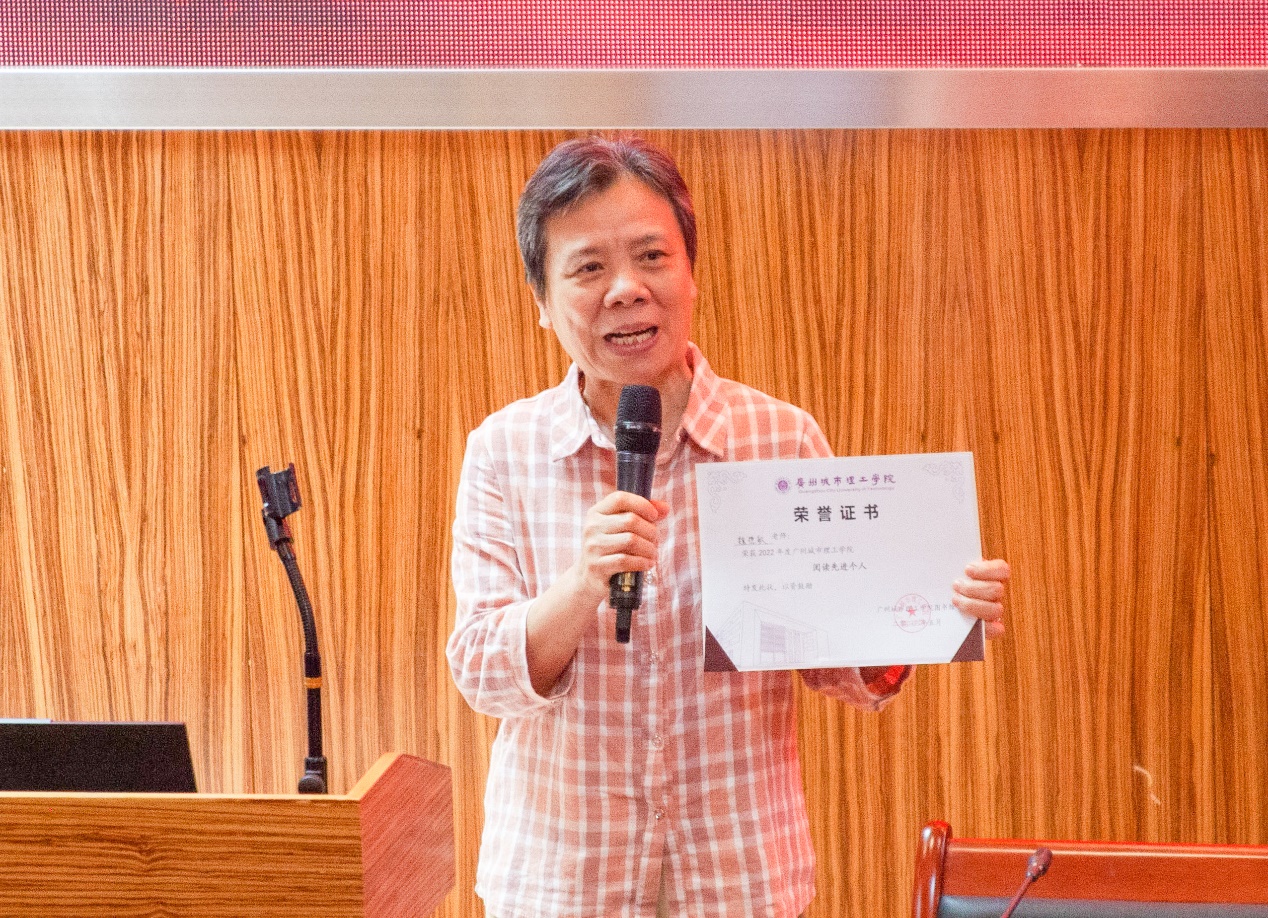 魏德敏作为教工组2022年度优秀阅读个人代表发言,她结合自身经历讲述了自己坚强、勇敢又热爱读书的母亲如何用行动将“活到老,学到老”的理念,言传身教给子女,并让阅读的习惯牢牢扎根心中的故事。发言结束,现场掌声雷动,经久不息,大家深受感动。