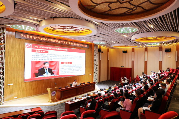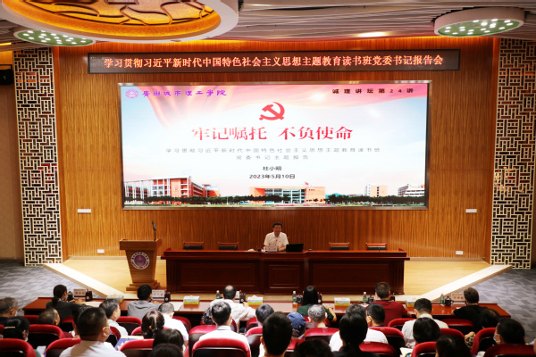 本网讯(记者 赵晶)为深入推动学习贯彻习近平新时代中国特色社会主义思想主题教育走深走实,5月10日上午,我校举行学习贯彻习近平新时代中国特色社会主义思想主题教育读书班党委书记报告会。省委教育工委主题教育第四巡回指导组副组长赵振辉、组员何丽燕一行到会指导。党委书记杜小明作专题报告。校领导、全体处级干部、基层党组织代表等参加学习。