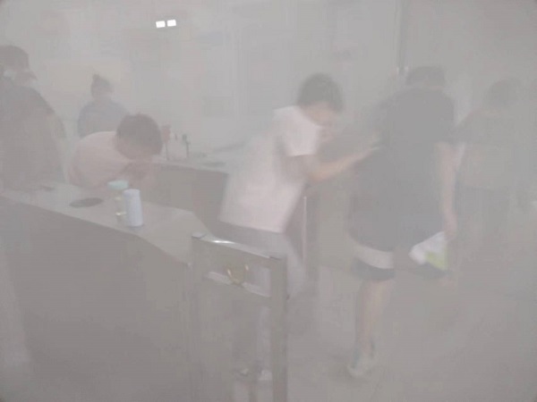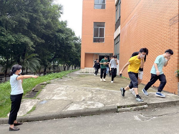 为真实展示应急自救效果,机械工程实验中心制定了详细的消防应急演练方案,准备烟雾弹、汽油和灭火器等必须器材设备,由黄永康进行现场演练指导。演练以实验室电线短路起火发生火灾(烟雾弹模拟),警铃响起时,启动消防火警疏散预案,学生在老师的指挥下迅速完成解锁逃生门、切断设备电源、逃生、自救、报警等演练环节,逃生演练结束后,老师对人数进行清点确认,确保全部学生疏散到安全区域。