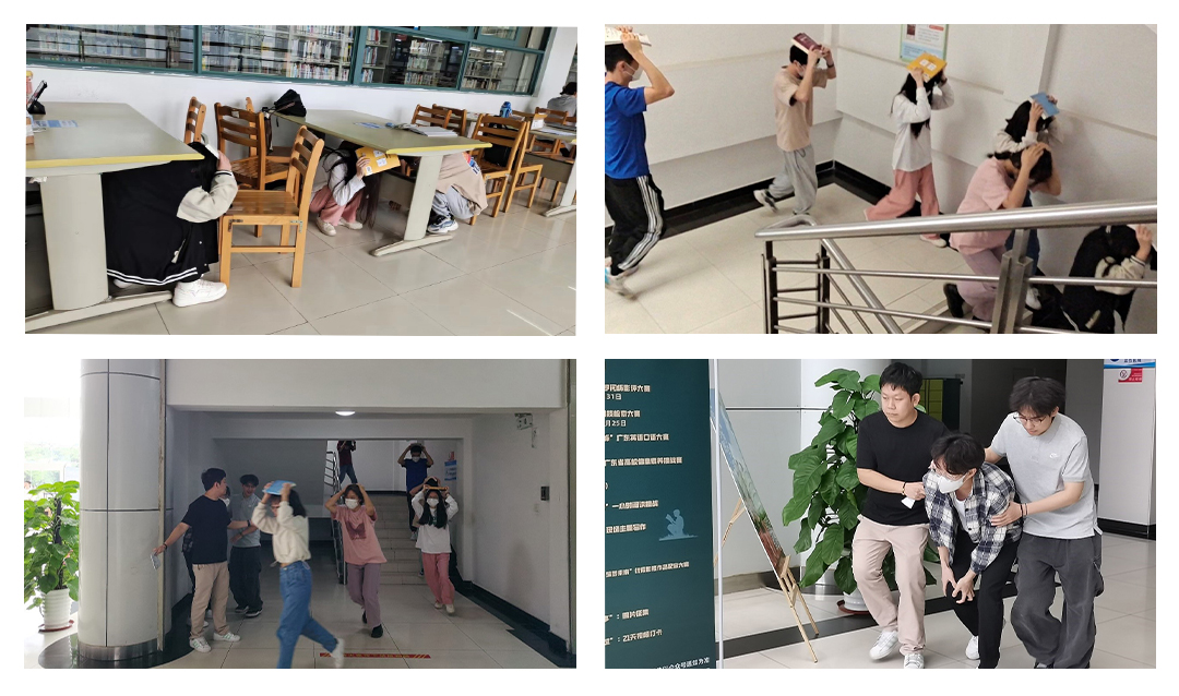 演练以实地模拟场景演练的形式开展,包括应急避震和紧急疏散两方面内容。为保证演练顺利、安全进行,图书馆和保卫处成立指挥小组,提前制定应急演练预案, 并对相关工作人员做了具体要求和明确了岗位职责。