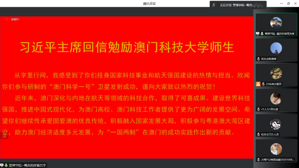 会议伊始,戴杰与与会师生共同学习了习近平主席5月23日给参与“澳门科学一号”卫星研制的澳门科技大学师生代表回信的精神。戴杰对同学们提出了三点希望:一要树立家国情怀,常怀报国之志,常有感恩之心,这是中华优秀传统文化的基本内涵和应有之义;二要树立明确目标,不论是学习还是考研,有了明确的目标就能指引我们前进的方向;三要有攻坚克难的顽强意志,大家可以想象把卫星送上天要经历千百次的推演运算和反复试验,学习和考研也有一个漫长的过程,需要同学们学会专心、专注,要排除外界的干扰。