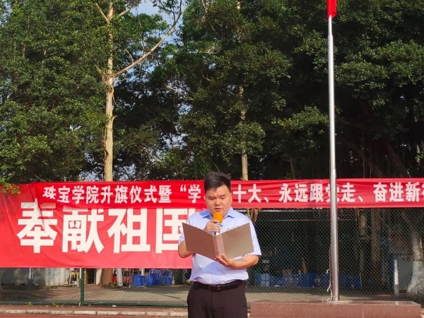 本网讯(记者 梁文静 李嘉文 文嘉俊)青春逢盛世,奋斗正当时。一个国家的进步,印刻着青年的足迹;一个国家的未来,寄望于青春的力量。为全面准确深入宣讲党的二十大精神,引导广大青年从学习中感悟马克思主义真理力量,确保学深悟透做实,树立共产主义远大理想和中国特色社会主义共同理想。珠宝学院师生于5月29日上午在足球场举行升旗仪式暨“学习二十大、永远跟党走、奋进新征程”主题实践活动。学院党总支书记刘喜锋、各年级辅导员老师及学院全体在校学生参加了本次升旗仪式。