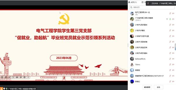 本网讯(记者 李嘉琪)为深入学习贯彻党的二十大精神,切实推动主题教育走深走实,进一步强化毕业生党员意识,增强毕业生党员的使命感和责任感,发挥党员先锋模范作用,6月6日晚上,电气工程学院学生第三党支部线上开展“促就业,助起航”毕业班党员就业示范引领活动。学院党总支副书记符红勋,学生第三党支部全体党员参加会议。