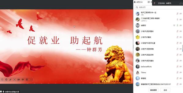 随后,开展了就业经验分享会。2023届电气工程及其自动化专业的曾港榕以大学期间学习和参与学术科技竞赛的经历为主线,分享自己在校期间各项工作经历与收获,并讲述了他在求职路上的面试技巧。他表示:“大家一定要做好自己的职业生涯规划,在秋招时期积极就业把握机会。”曾港榕目前已在广州发展新能源股份有限公司实习,并获得录用通知,在校期间他曾获国家励志奖学金、学校二等奖学金、第八届中国国际互联网+大学生创新创业大赛省级“铜奖”、第二届高校电气电子工程创新大赛华南地区“一等奖”等多项荣誉。