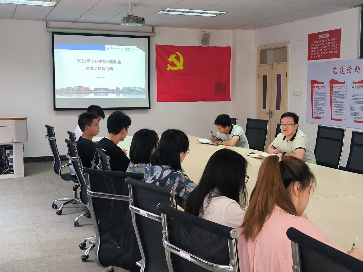本网讯(记者 陈磊)6月15日下午,建筑学院在A10-207开展毕业生党员座谈会暨廉洁教育学习。学院书记陈磊、学生党支部书记、2023届毕业生党员参加会议。