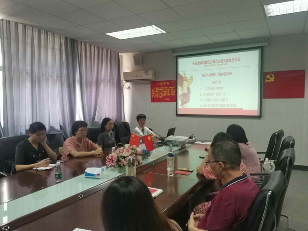 本网讯(记者 陈立平)为深入开展学习贯彻习近平新时代中国特色社会主义思想主题教育,进一步增强党性观念,6月29日,外国语学院教工第二党支部开展了“回忆入党历程,增强党性意识”主题党日活动。