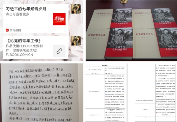 5月至6月中旬,为自主学习阶段。为便于学习,每个党小组分为两个阅读小队,共计6个小队分头进行书目的流转阅读,每位同志至少阅读《习近平的七年知青岁月》的2篇采访稿,《论党的青年工作》的3篇讲话。同时,为了让学有余力的同学广泛阅读、深入阅读,支部还分享了学习强国平台中两本书目的电子版。同志们在阅读中思考,用心做好笔记,感悟总书记的成长之路和对青年的期望。