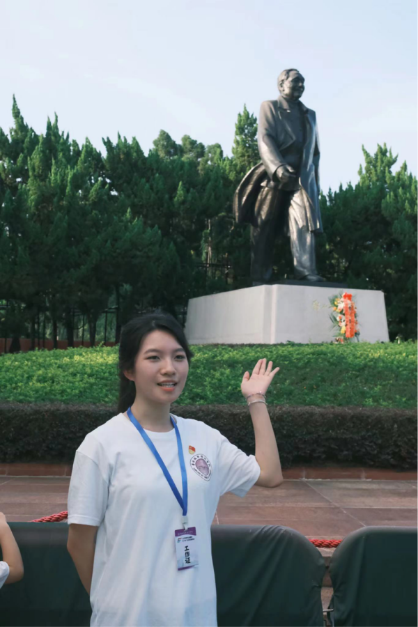实践团成员梁乐桐在莲花山顶邓小平铜像广场演讲(黄思琪 摄)