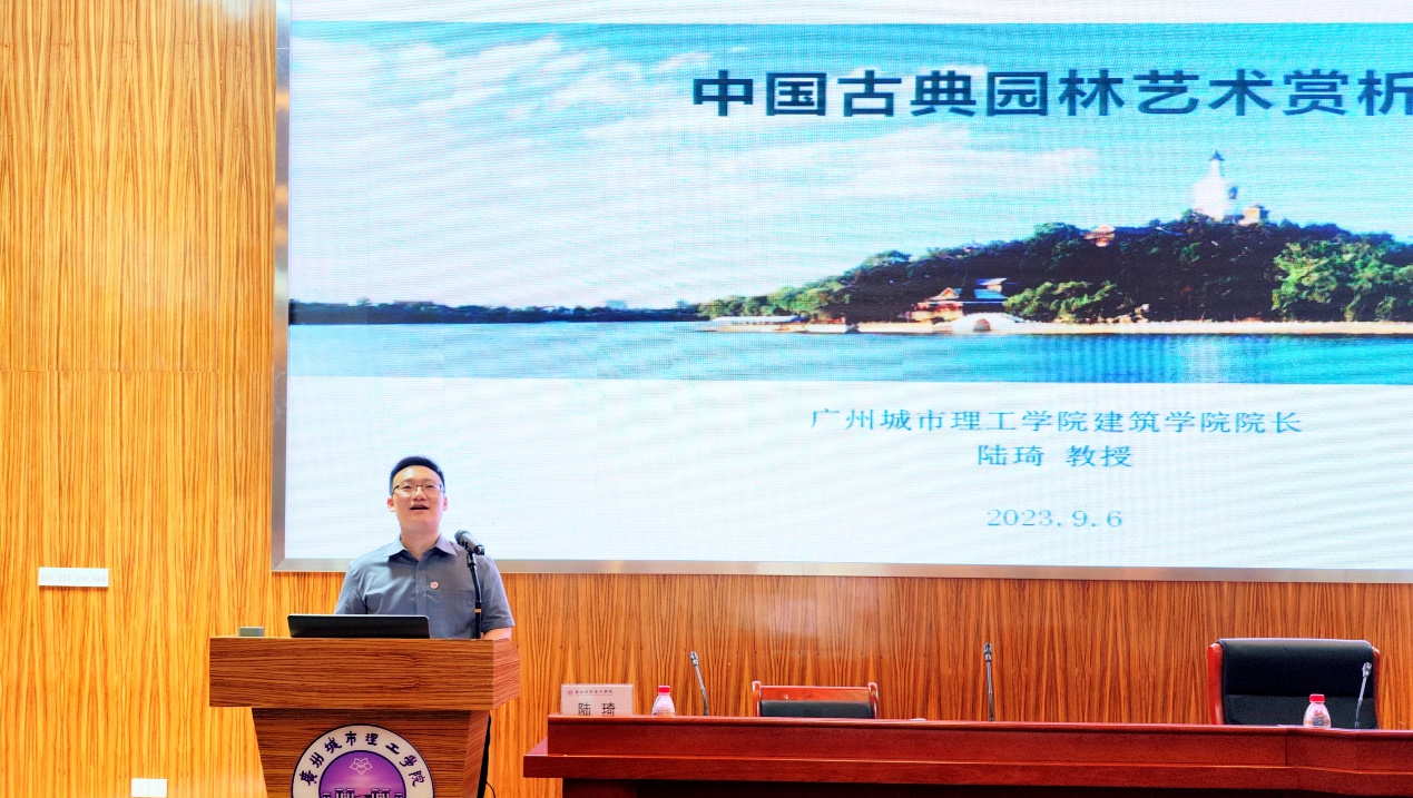 随后,陆琦上台进行主题分享。他首先祝贺我校风景园林专业首届招生并结合讲座主题,从中西方两个方面对比分析了园林、景观建筑学的定义、概念以及共同特点。陆琦讲道:“习近平总书记指出,我们一定要重视历史文化保护传承,保护好中华民族精神生生不息的根脉。在今年6月2日文化传承发展座谈会上,习近平总书记强调,中国文化源远流长,中华文明博大精深。只有全面深入了解中华文明的历史,才能更有效地推动中华优秀传统文化创造性转化、创新性发展,更有力地推进中国特色社会主义文化建设,建设中华民族现代文明。”