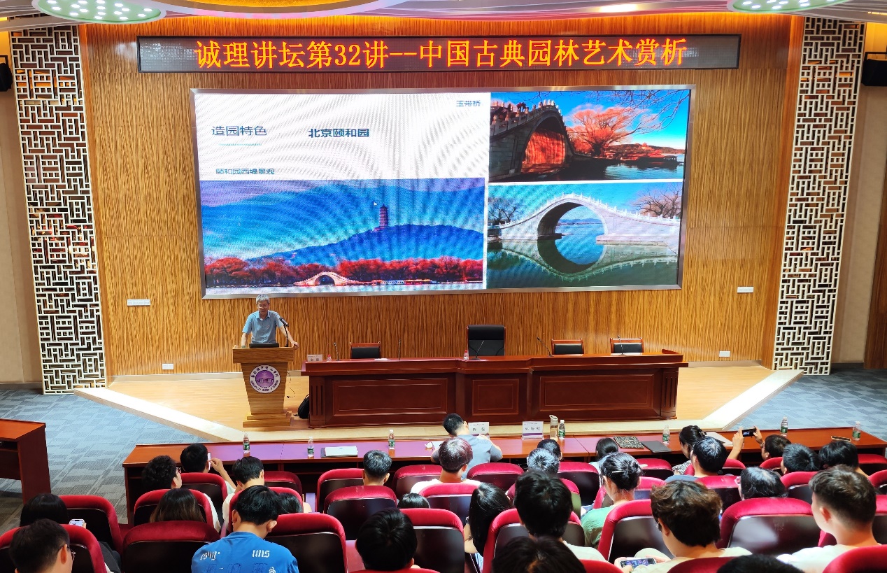 本网讯(记者 蔡映玲 吴有权 陈磊)9月6日晚,我校在行政楼703举行“诚理讲坛”第三十二讲之“中国古典园林艺术赏析”专题讲座。本场讲座由建筑学院和图书馆联合承办,建筑学院院长陆琦教授担任主讲,学校图书馆馆长郭培虹、全校师生代表两百余人参加。讲座由建筑学院书记陈磊主持。