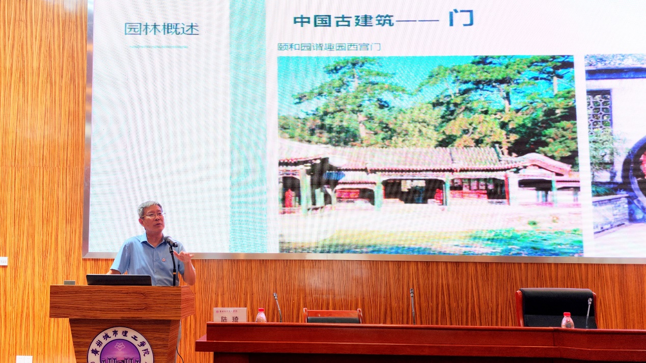 陆琦表示,今天主要是向广大师生普及中国古典园林的历史性和艺术性,抛开专业学术语言,从平常欣赏的角度来认识和感受中国古典园林。他阐述了要从物象美、意象美、意境美三方面来体会园林的形式美、内涵美和升华美。他以黛玉葬花为例,指出园林审美与时间、空间、人的心理活动等因素有关。随后,陆琦详细介绍了古园林类型、中国古园林建筑结构类型、古建筑屋顶形式、庭院庭园组合。根据建筑布局和建筑区域的划分,陆琦结合大量的实景照片和案例,讲述了门、殿、厅、堂、楼、阁、馆、轩、斋、舫、亭、榭、廊、桥、塔、牌坊、院落、庭园以及园林的区别。他还介绍了叠石、理水、抑景、障景、透景、漏景、对景、框景、借景等不同的造园手法。最后,他以北京颐和园为案例,通过对颐和园和万寿寺平面图、宫殿区轴线图等进行分析,讲解了园内各类建筑的功能、历史背景和文化意义,呈现了颐和园不同角度、不同节气的园林景观特色,向师生们展示了皇家园林的造园特色和建造特点。