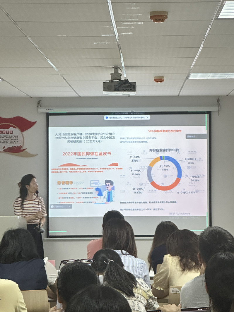 讲座伊始,心理中心主任鲁丹凤从抑郁症谈起,分析抑郁症这一高校高发症状的主要两点原因——人际关系以及家庭问题。从而引出教师应该如何有效地与学生交流,以此来预防抑郁症的发生或加深。她表示,教师与学生交流一要秉承着保密原则,不能透露与学生交流的具体内容;二要做好谈话的外在环境准备,如谈话环境的色彩、软装等,舒适的外在环境能给学生放松的感觉,可以避免紧张等不良情绪;三要做好身体语言的准备,如专注的看向学生,向学生表达一种认真的态度。教师只有做好充分的准备,才能更好地与学生进行交流沟通。