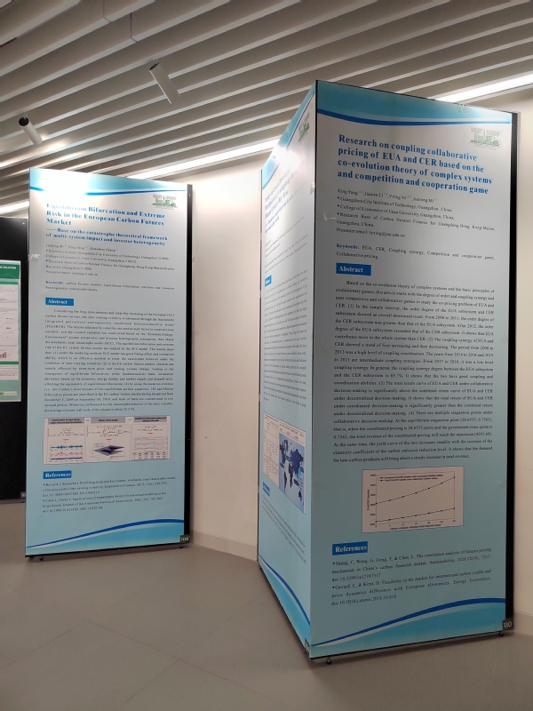经济学院提供“Equilibrium Bifurcation and Extreme Risk in the European Carbon Futures Market——Base on the catastrophe theoretical framework of multi-system impact and investor heterogeneity”“Research on coupling collaborative pricing of EUA and CER based on the co-evolution theory of complex systems and competition and cooperation game”“Study on Green Development Mechanism of Guangdong-Hong Kong-Macao Greater Bay Area —— Based on comparison with the other three major bay areas in the world”等3篇学术论文被安排在会议现场进行展示。