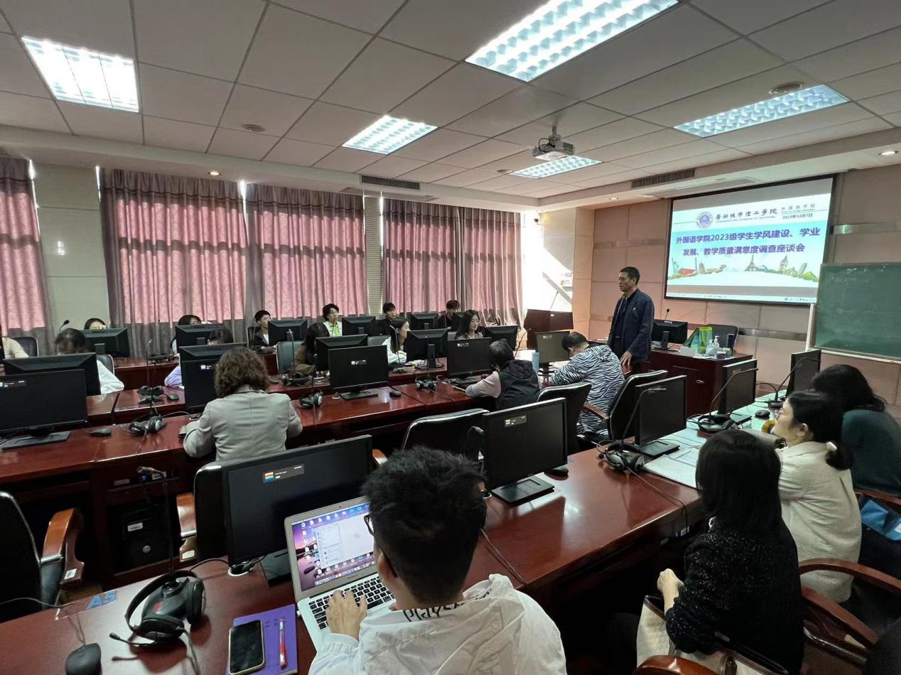 本网讯(记者 辜雅子 蔡晓坤)为深入了解学院教学质量,掌握2023级学生学业发展情况和学生对教学的满意度,促进学风建设,外国语学院于12月7日下午在A6-213召开“师生面对面”——2023级学风建设、学业发展、教学质量满意度调查座谈会。学院书记张四友、副院长乔世燕、各教研室负责人、学生工作办公室负责人、2023级班主任、2023级学生代表参加了此次座谈会。