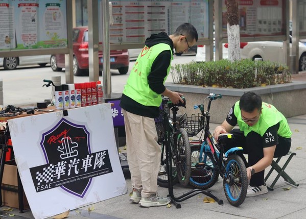 华汽车队的志愿者帮助修理自行车(李胜奇 摄)