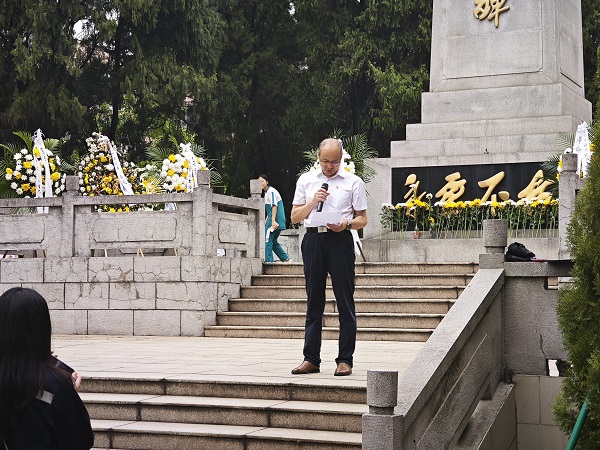 本网讯(记者 林奕丹)为深切缅怀革命先烈,弘扬爱国主义精神,3月30日上午,电气工程学院党总支联合广州城北电力工程有限公司(以下简称“城北公司”)党总支前往花都革命烈士陵园联合开展“缅怀革命先烈 传承红色基因”主题党日活动。城北公司党总支副书记黎健生、公司党员及团员代表,电气工程学院党总支副书记符红勋、副院长沈娜、教师党员代表、学生党员代表、第2期青马班成员参加了此次活动。活动特邀退役陆军上校刘武松作为分享嘉宾。