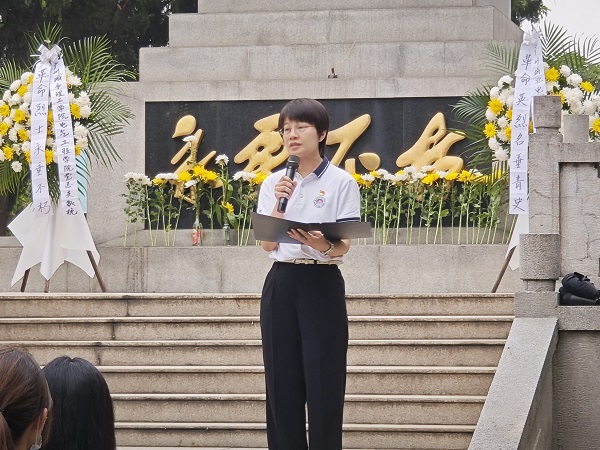 在纪念碑前,全体人员向革命烈士默哀,并依次敬献鲜花,深表哀思。随后,学生党员代表林荣浩诵读致敬词。从近代的夏明瀚谈到当代在中印冲突中牺牲的战士,“英雄是史册上闪闪发光的名字,是无数无名者共铸的丰碑。他们的功绩,祖国不会忘记,人民不会忘记!”他饱含激情、掷地有声,表达了对先烈的崇高敬意和深切缅怀。城北公司团支部副书记黄敏仪则表示,烈士陵园祭扫活动是一场心灵的洗涤和思想的洗礼。作为新时代的青年,要传承先烈们的革命精神,从各方面提升自我,为实现国家富强、民族振兴、人民幸福贡献自己的力量。