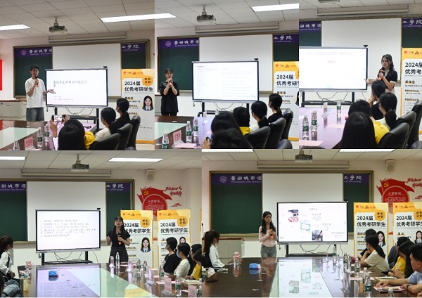 会上,五名考上研究生的同学分别作了分享。产品设计专业的蔡梓滢同学,被广州美术学院录取,她通过介绍学校的考试科目、招生计划、以及专业课风格等,为现场学弟学妹们做了针对性的分析。姚琦同学从宝石专业调剂到东北石油大学地质资源与地质工程专业,他详细讲述了如何调剂,并感谢在考研期间一直陪在自己身边加油打气的好朋友,他表示,“在难熬的考研日子里,身边能有一个一直陪同、相互鼓励的人,也是对抗考研压力和焦虑的有效办法”。冯绮楠作为一名跨专业考研的学生,除了和师弟师妹们分享如何准备跨专业考研之外,还分享了自己平时怎样缓解焦虑情绪等。蒲庆讲述了自己复试如何从47名成功逆袭,最终以第15名的好成绩成功上岸的经历,鼓舞和激励了很多同学。冯颖贤就如何申请境外学校展开了深入分析,从为什么想考研、为什么想申请境外研究生,以及境外研究生申请时的注意事项等方面分享了整个申请流程。