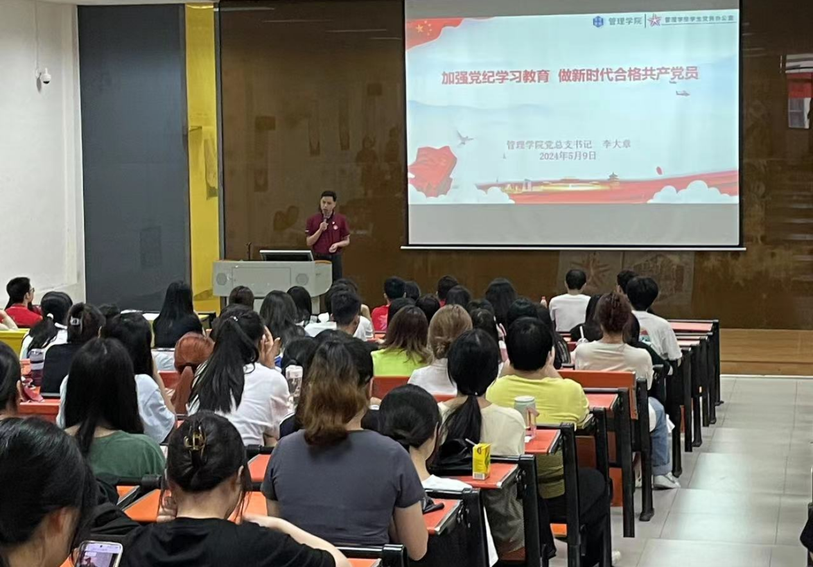 本网讯(记者 熊洲仕 邓碧聪)为深入学习贯彻习近平总书记关于党纪学习教育的重要讲话和重要指示精神,开展好学院党纪学习教育,5月9日下午,管理学院党总支书记李大章在A9-101以“加强党纪学习教育 做新时代合格共产党员”为题,为学院师生党员、入党积极分子等共计241人讲授党纪学习教育专题党课。