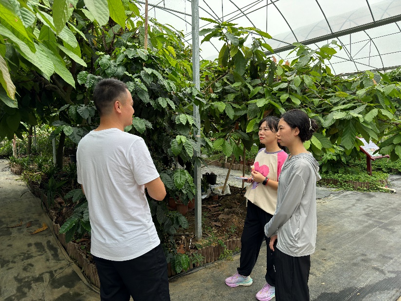 调研团队师生走进热科农场参观了大棚热带作物,包括有“巧克力之母”的可可树、“香料皇后”香草兰、经过培育一株多色的三角梅,还触嗅了经常使用在点心上的斑斓叶。陈磊表示,希望今后能与热科农场共建教学实践基地,为建筑学院风景园林专业学生开展植物认知课程以及劳动教育等提供实践场所。