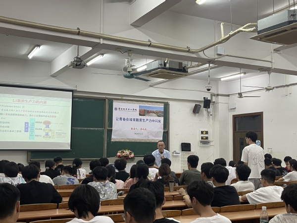 课上,李礼夫深入阐述了“新质生产力”这一概念的内涵与重要性,以及加速形成“新质生产力”的关键要点和途径,特别强调了高等教育在培育新质生产力中的重要作用,鼓励在座的青年学子积极承担起推动社会进步的责任。他还通过实际案例分析和互动问答,引导同学们思考如何将“新质生产力”的理论应用到实践中去,并强调学习的重要性,期望同学们能够在党的领导下,为国家的发展作出自己的贡献。他提出,作为未来的复合型人才,青年学生应积极面对挑战,在挑战与机遇并存的环境中建功立业,参与科技创新,顺应时代的潮流,勇于实践创新。