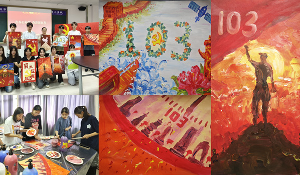 党课学习结束后,学生们进行了实践活动,以庆祝建党103周年为主题进行了彩绘创作。每一笔,每一划都表达着珠宝学子拥护党、热爱祖国的真挚情怀。创作结束后,优秀作品在A7一楼展出,引来学生驻足欣赏。