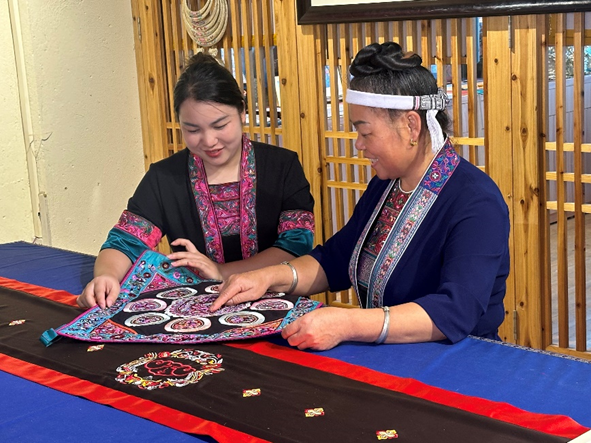 传承人韦清花和覃桂珍交流侗绣(文淼莹 摄)