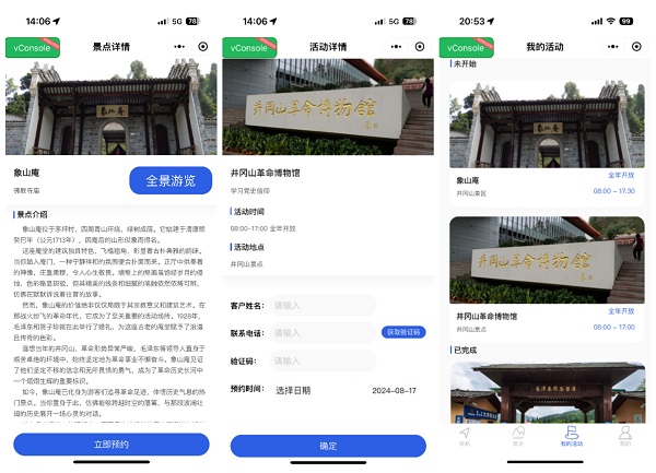 为了提高景区的智慧化管理程度,提升游客旅游满意度,实践团成员们经过前期的周密准备、详尽的实地调研、后期的完善补充,开发了一款井冈山革命传统教育教学点电子导航及中英文讲解小程序。该小程序实现了六大功能:电子导航、中英文讲解、“一站式”预约、活动记录模块、AI小井、全景游览,不仅为游客提供了便捷、精准的路线指引,确保他们轻松穿梭于景区各个角落,还通过AI小导游、720°VR全景导览等功能,让游客能够深入了解历史文化及特色景点背后的故事,极大地丰富了游客的体验感,实现了智慧旅游的新跨越。