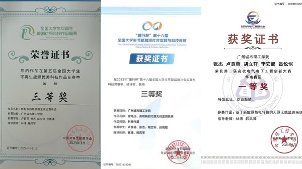 在指导老师的带领下,他和队友互相信任、互相支持,凭借着那份热爱与执着,默默耕耘,终于在2023年收获胜利的果实。这一年,他获得全国大学生可再生能源优秀科技作品竞赛全国三等奖、“建行杯”第十六届全国大学生节能减排社会实践与科技竞赛全国三等奖、第十七届“挑战杯”广东大学生课外学术科技作品竞赛省级三等奖、第二届高校电气电子工程创新大赛华南赛区一等奖、粤港澳大湾区IT应用系统开发大赛省级一等奖等奖项。